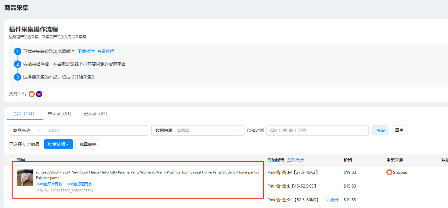 在商品采集页面点击【批量认领】,可将货源商品认领到平台采集箱,商品认领状态更新为已认领