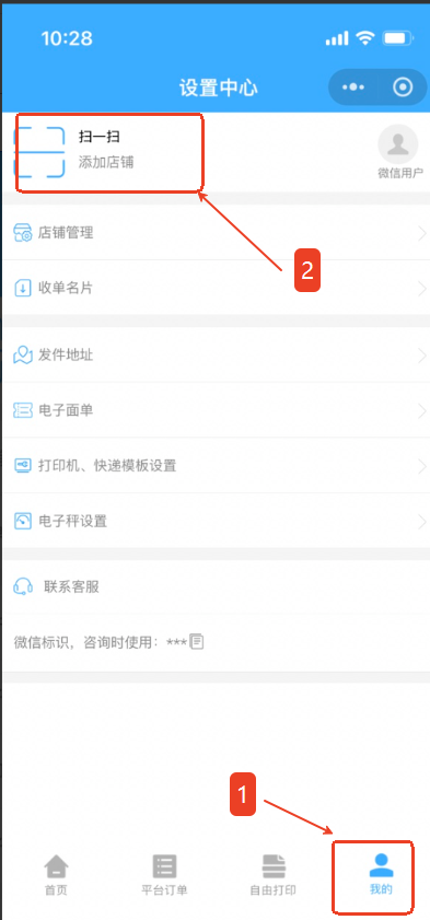 2、打开店管家微信小程序(店打单),点击“我的”>“扫一扫”绑定店铺;
