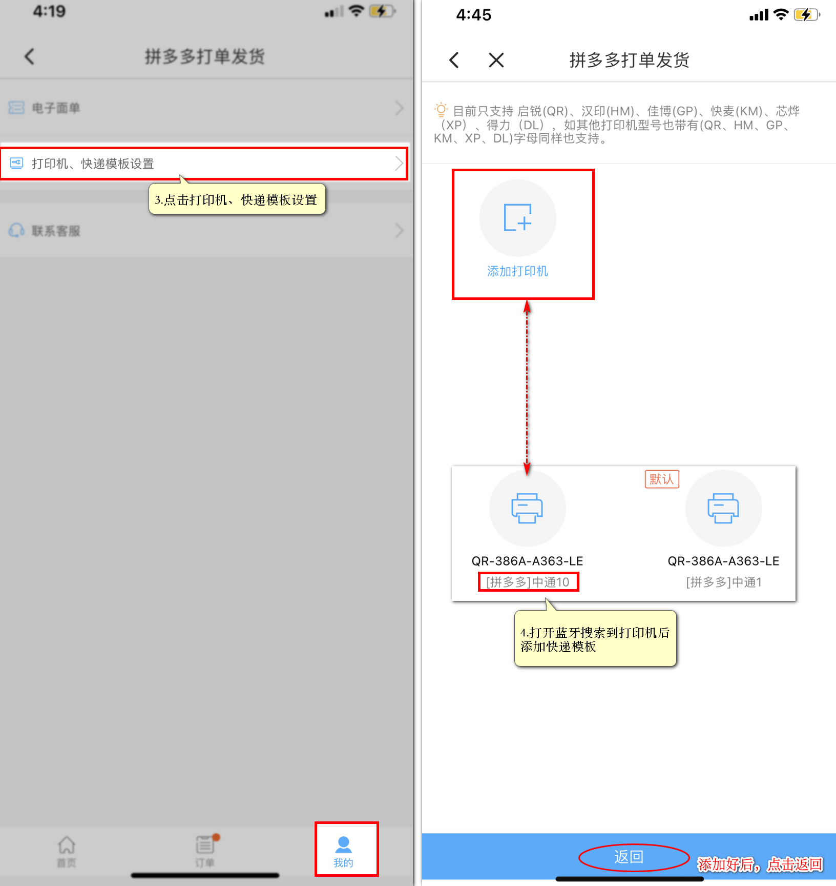 3.点击“我的”,点击打印机、快递单模板设置,开始设置连接打印机,及选择快递模板。