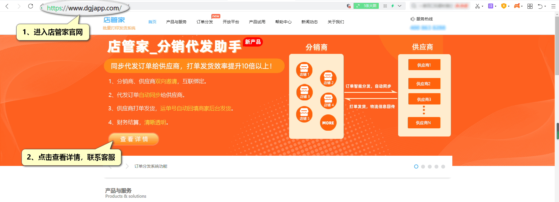 第一步:进入店管家打单平台,联系在线客服进入订单分发系统(店管家_分销代发助手)。