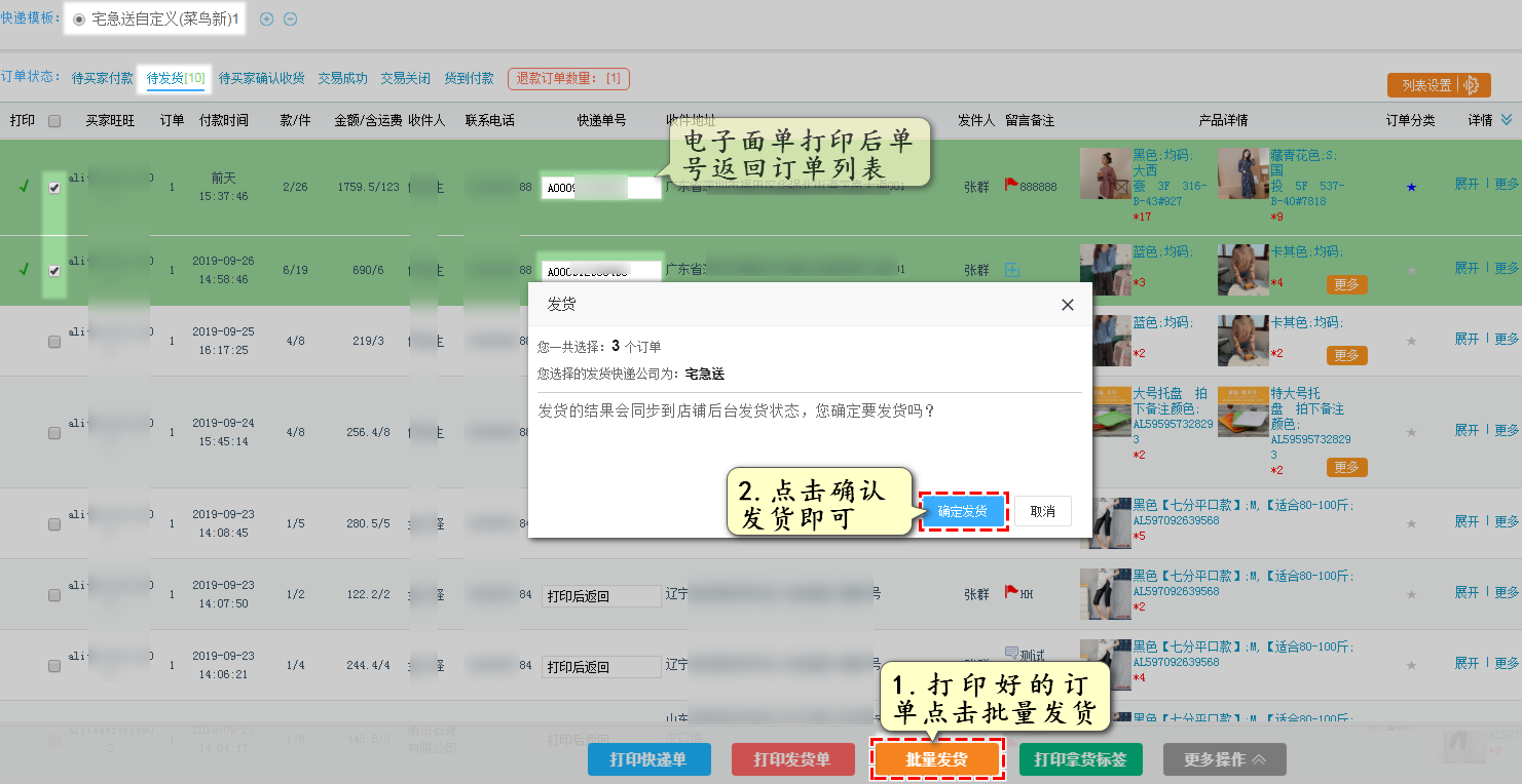 单号返回订单列表后,点击批量发货就会同步到店铺后台,完成发货