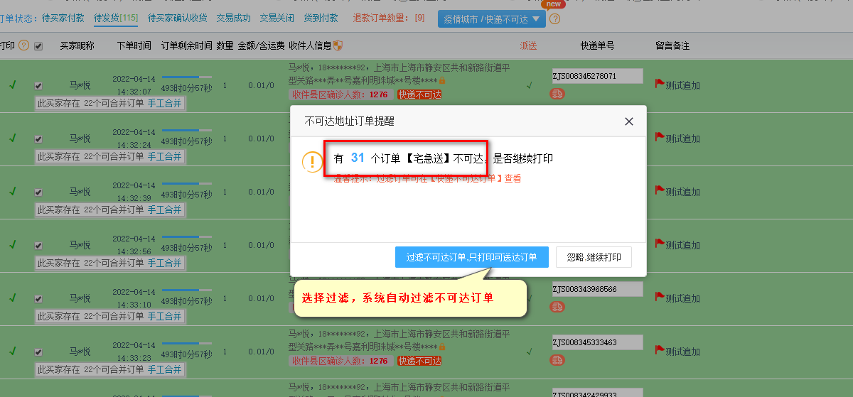 批量打印时包含不可达订单,可一键过滤,保证正常打单发货;